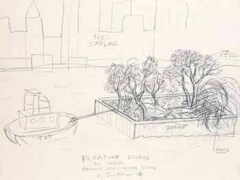 The landmass, an idea by Robert Smithson, will temporarily add a new island to archipelago New York: “the flat-deck barge will hold earth, shrubs, rocks and seven specimens of trees native to the region that will rise 30 to 35 feet. Smithson drew the concept for ‘Floating Island to Travel Around Manhattan Island’ in 1970, but budget and permit issues derailed the plan’s realization, and he died in a plane crash three years later. [Could this, indeed, have been Smithson’s last, albeit suicidal, earthwork: ‘Fiery Dent in Earth’s Surface’…? ‘Artist’s Disappearance into the Planet at High-Speed’…?] The project, budgeted at around $150,000, is a collaboration of the Whitney Museum of American Art and New York-based art group Minetta Brook, and will run from September 17 to 25, after which the trees will be moved to a permanent island and replanted in Central Park.”