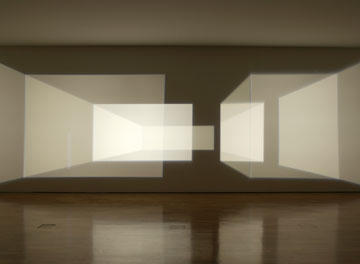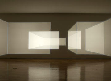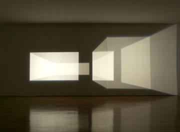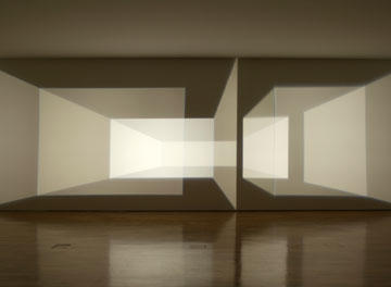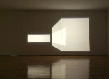 It’s projections of light onto a wall, in architectonic forms; the angles of the projections are worked out so that depth perception kicks in and then space appears to be receding into the wall in front of you – but it’s just light, at the right angles, sequenced. A four-dimensional film, so to speak – via a flat surface. Or: space as film (light: projected). Illusions thereof.