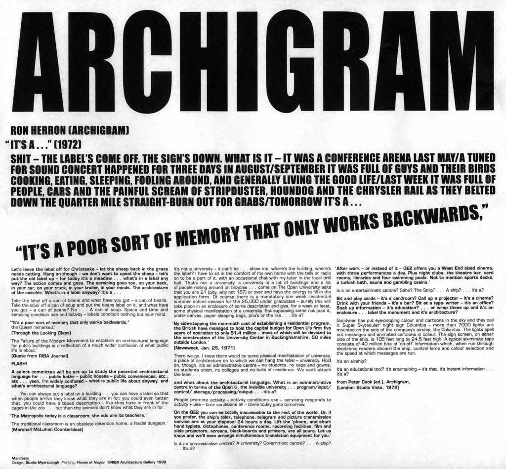 First, Archigram wheel themselves in on their walkers, or push one another through the door in their wheelchairs, drooling and stricken, and they drum up some enthusiasm – and Zaha Hadid and Norman Foster and Frank Gehry and Santiago Calatrava and… and… and… – and they put their manifestos on the walls.