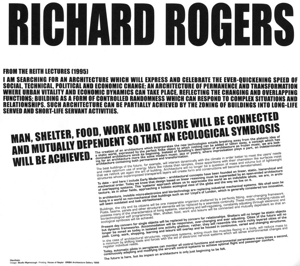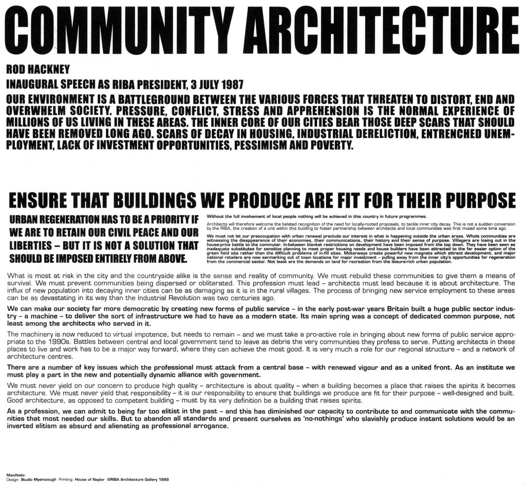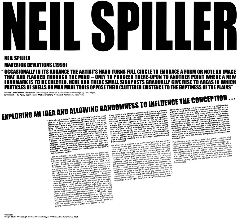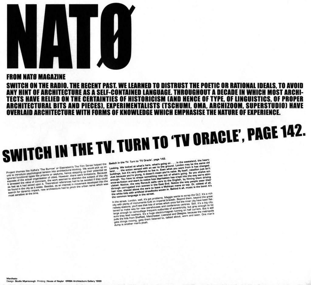 [Images: From a 1999 RIBA Gallery exhibition I attended; tear-off pads were affixed to the walls, with each pad bearing one of these mini-festos, repeated 200-250 times. And, yes, that means I’ve been saving these things in a file for 6 years… These are my own (crappy) scans. But the tear-off pad as a method of architectural publication is absolutely great and full of DIY potential; imagining here a guerilla reprinting of everything ever posted to BLDGBLOG, with each entry assigned its own pad, then a gallery tacked full of the things… Anyway, click on images to enlarge (and read): it’s the late return of the architectural mini-manifesto].