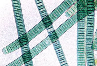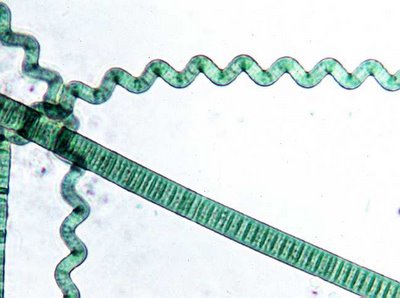 [Images: Like screen captures from a Stan Brakhage film, these are the elegantly named Oscillatoria and Spirulina cyanobacteria].