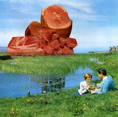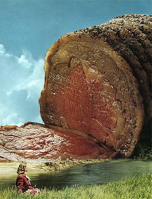 More foodscaping, this time huge piles of meat collaged into the background of 1960s-era postcard-like landscapes by artist Nicolas Lampert:
