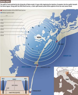 BLDGBLOG has been doing its homework, and we’ve found that the New Scientist explained all this way back in 2004: “Venice’s problem is largely one of subsidence, both natural and man-made. From the 1930s to the 1970s, fresh water was pumped out of underground reservoirs beneath the city to supply surrounding factories. As the water was pumped out of these aquifers – which are rather like rocky sponges – their water-filled pores compressed and the ground sank. Combined with sea-level changes, this has produced an effective rise in sea level of 23 centimetres over the past 100 years.”