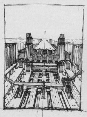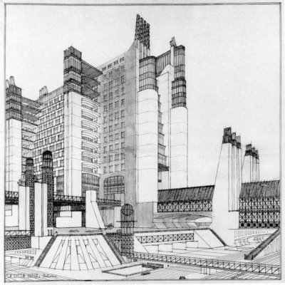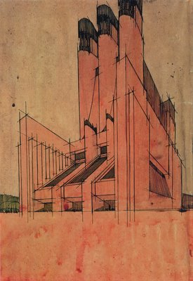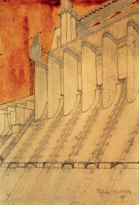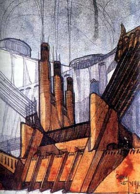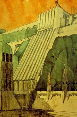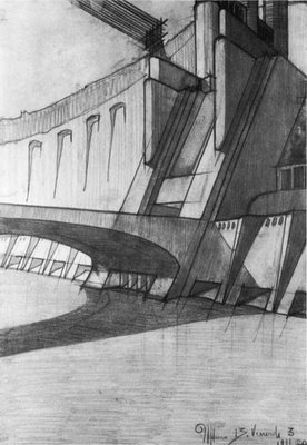 Meanwhile, the images that you’re seeing scattered throughout this post are all by Italian Futurist architect, Antonio Sant’Elia. Not a single one of them is of a tidal fence, a tidal turbine, or even of a hydroelectric dam; but his obvious exuberance for monumental power-generation structures is: 1) so bizarre it’s almost touching; and 2) just waiting to be copied by a new generation of architects, gamers, novelists and filmmakers.