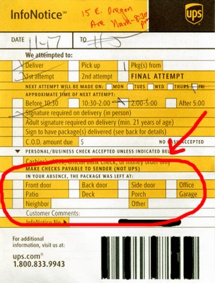 That’s exactly what I was wondering: what does UPS do in a country where people don’t have porches and decks – I mean, obviously their business isn’t incapacitated by this architectural absence, but how do UPS tags elsewhere in the world describe and account for local architecture? The UPS vernacular.