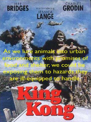 How do other species survive in our cities? King Kong, The Birds, Willard, King Rat. The brutalist concrete masses of Modernist architecture, swelling upward into towers on the edges of parks. Distracting birds to their death. Home to roaches and rats.