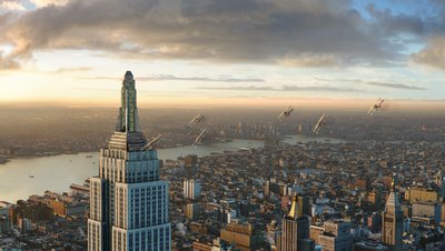 [Image: Peter Jackson’s entirely computer-generated Manhattan, created for his remake of King Kong; spotted at this quick and entertaining history of that film, including early Modernist high-rise design, Italian futurism and the radio dreams of an earlier era – reactions to the city, crossing species lines].