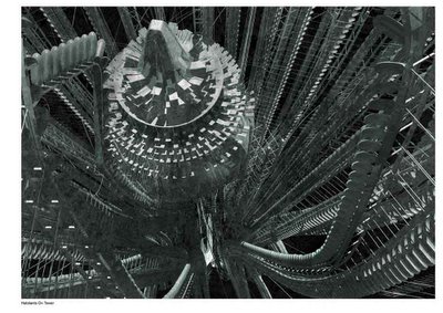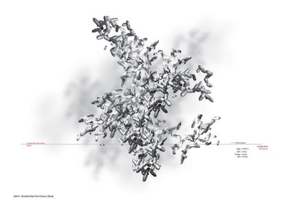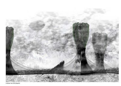 This is V.En. (Vertical Energy), a project by Yew Choong Chan, sited in the Lea Valley, London. It starts off with some swarming and growth diagrams – of both bacteria and birds – extrudes a series of mechanical towers out of that motion-structure, then projects all of this roughly 50 years into the future.