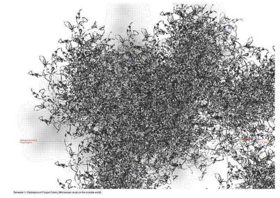 [Images: Two “living studies” by Yew Choong Chan: “Escherichia Coli Colony Study Microscale” and “Cladosporium Fungi Colony Microscale,” part of V.En. (Vertical Energy), Lea Valley, London].