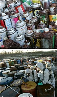 [Image: “Workers in protective gear inspecting drums for toxic chemicals last week at a reclamation site near Buras, La., near the Mississippi River levee. The detritus included piles of discarded spray cans, top.” Ozier Muhammad/New York Times].
