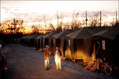 As the subtropical ruins of New Orleans continue to mold, buried under mountains of now toxic rubbish (“Contractors have disposed of more than six million pounds of waste… There have been 222,000 refrigerators, washers and dryers gathered, and more than a million containers of hazardous waste have been plucked from land and sea”), the less fortunate members of that obliterated city’s displaced population now live in temporary camps – “canvas cities,” as the New York Times calls them.