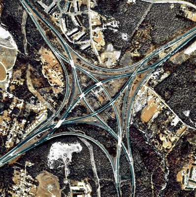 1. I’ve driven through this thing dozens of times, I was headed north on 95 out of town this evening after reading this post so I paid special attention to it. The surprising thing is that all this intricacy isn’t apparent at all from the ground. The slope of the land around it, the trees, and the heavy traffic make the complexity imperceptible.