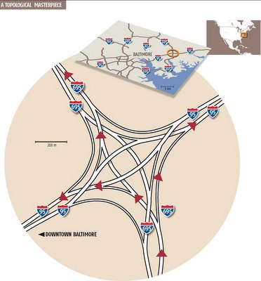 “In the spring issue of The Mathematical Intelligencer, Michael Kleber, a topologist at MIT, waxed enthusiastic about [the interchange’s] ‘non-trivial braiding‘: while it is possible to just lift I-95 up and away from I-695, the northbound lane of I-95 braids both over, and then under, the southbound lane, making it impossible to pull them apart without cutting one of the lanes.”