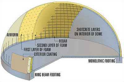 [Image: Anatomy of a dome: “The Monolithic Dome is a super-insulated, steel reinforced concrete structure used for homes, schools, gymnasiums, bulk storage facilities, churches, offices, and many other uses”].