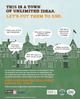 In a nutshell, the program is called the Ben Franklin Coffeehouse Challenge, and it’s sponsored by Starbucks. The idea is that you get some people together, discuss something you’d like to see happen in your community – more benches, a new park, some fresh paint on the neighborhood bus stop, a film society, a mural or two, a NASCAR track, fewer potholes, some roof gardens, a new running path – meet a few more times to refine the idea, then you organize it into a coherent, workable plan.