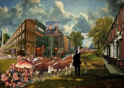 If you look closely at the swiss cheese city picture, you’ll recognize that part of it is a typical Chinese Propaganda poster image. (Like you’d see in: http://www.amazon.com/gp/product/9054960094/qid=1136578515/sr=8-3/ref=pd_bbs_3/104-6911723-7044745?n=507846&s=books&v=glance (a fun book if you like this sort of surreal chinese communist poster art. It’s kind of a Lenin-meets-Confucious insanity with a heavy dose of courageous, progressive, inhumanly cheery and resolute idealized Asian portraits mixed in.)