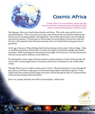 In any case, Cosmic Africa is the name of a 72-minute film, produced by and starring Medupe. (Reviewed here by Variety).
