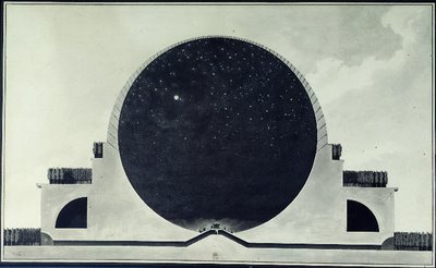 In 1784, utopian designer and speculative architect Etienne-Louis Boullée designed a Cenotaph for Newton, or tomb for Isaac Newton. It was ridiculously huge, its dome pierced by small holes to shine as new constellations, illuminating visitors from above with artificial stars.