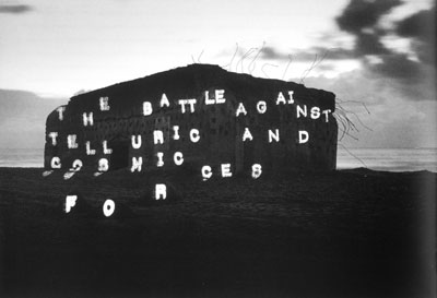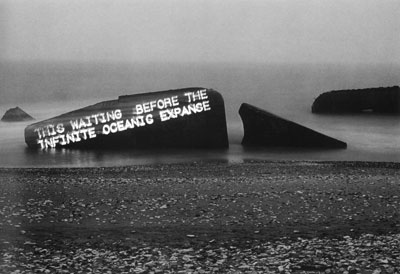 – in which she laser-projected select quotations from, what else, Paul Virilio’s Bunker Archaeology onto the half-submerged fortifications found scattered along Normandy’s beaches.