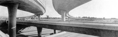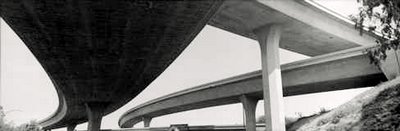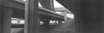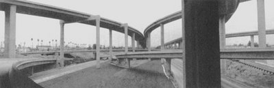 I suppose it’s not even outside the realm of possibility to imagine, several hundred years from now, after nearly everyone’s died of bird flu, AIDS, or open civil warfare, that freeways – those massive examples of widespread land use, the world over – could be reclaimed, domesticated, built upon as new foundations. Houses in the midst of highway flyovers, cloverleaf junctions given windows, bedrooms constructed on off-ramps. New feudal worlds of elevated flyovers, towns held aloft in the sky.