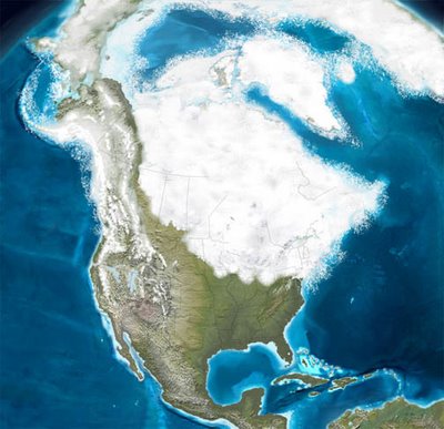 Till North America hits its Ice Age. Thousands of acres of frozen arches stand whistling in frigid winds above the future site of Washington DC. Humans huddle in caves – then move south, populating the New Mexican desert. Global sealevels drop, revealing caverns in the coasts of every continent.