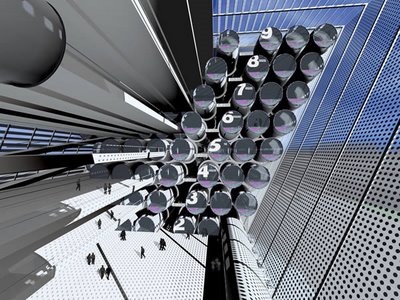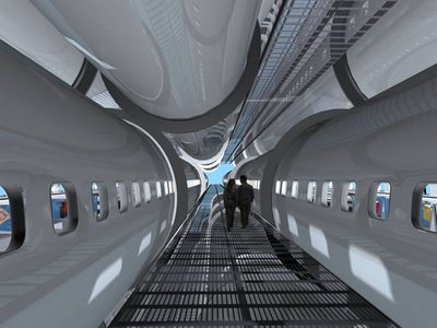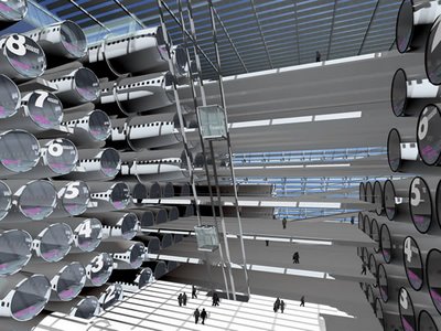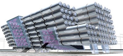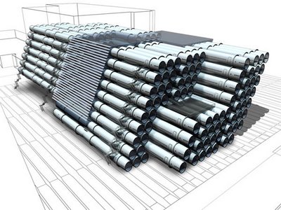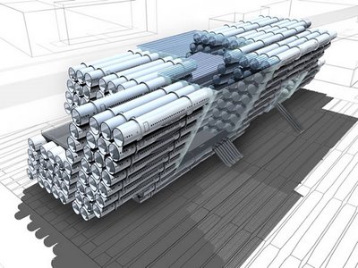 This is practically begging for puns about mass transit, air traffic, and flights of fancy. So here goes. How about they add wheels to those fuselage and drive them around town, one at a time? It’s the bookmobile-meets-parking-garage concept. Amost as sexy as the Oscar Mayer Weinermobile, but bigger, and just as likely to get boys into the stacks. I realise that this arrangement of tubes is very efficient, but wouldn’t it have been more aesthetically convincing if it had been arranged in the holding patterns of flights over a particularly congested airport? After all, on any given day, airports become high-rise waiting lounges. Yet, to my knowledge, no one has taken this as an inspiration for a fixed structure. Think of it, a return to modernist aesthetics could coalesce around functional ephemera based on transport: flight patterns turned into structures; traffic jams turned into dynamic parks (ha! literally); subways and trains turned into ‘sleeper’ communities, and; patterns of boat/ship traffic as the basis for the design of institutional workspaces, where larger centres and smaller out-buildings interact as part of the working day.