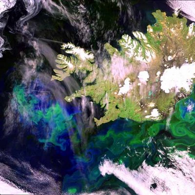 [Image: Here we see phytoplankton illuminating the Denmark Strait, forming solar-mineral arabesques, glowing traces. “While phytoplankton are tiny taken by themselves, together they can cause color shifts in ocean water, which in turn is detected by orbiting spacecraft.” Next, you build triangular frames, squares and circles afloat on the ocean – then fill them all in with phytoplankton: a sea of shining geometry. Cubes of light cast adrift across the North Sea, photographed from below by divers. Courtesy European Space Agency].