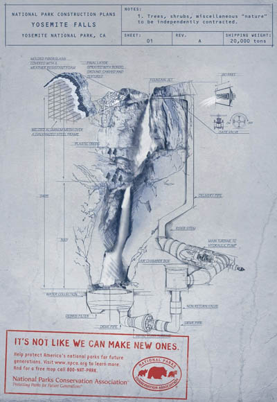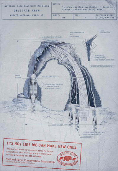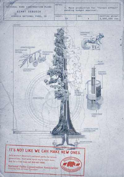 [Images: An ingenious ad campaign by Y&R for preserving America’s National Parks: landscapes blueprinted, seeds diagrammed, arches shock-absorbed. Here are Delicate Arch (PDF), Yosemite Falls (PDF), and Giant Sequoia (PDF)].