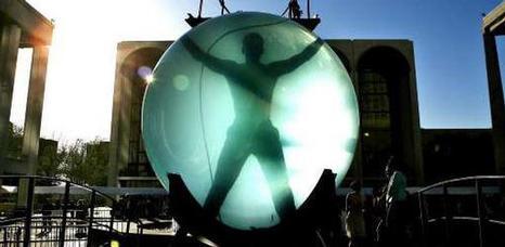 Simultaneous with David Blaine‘s final moments sealed inside a sphere of water, intravenously fed by tubes on the steps of Manhattan’s Modernist opera house – Blaine’s ball was actually a “ten-foot tank with 1.5-inch-thick insulating acrylic walls, filled with 2,000 gallons of spring water,” surely making Archigram roll in their collective architectural grave –