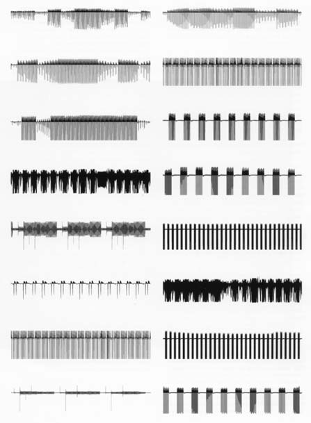 The images, below, represent the sound files those sounds produced, digital noise-maps of urban space.