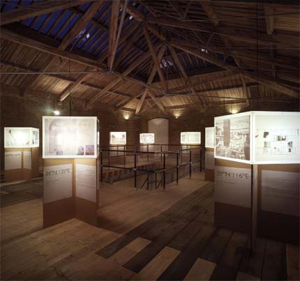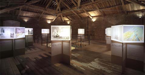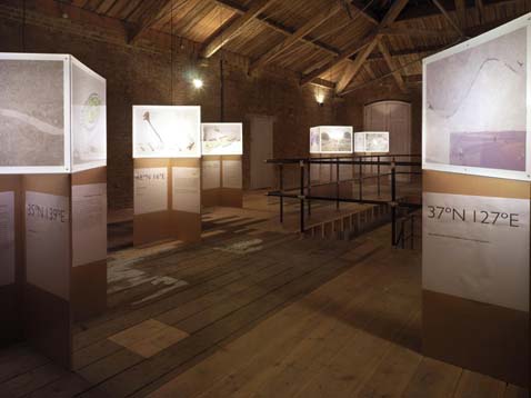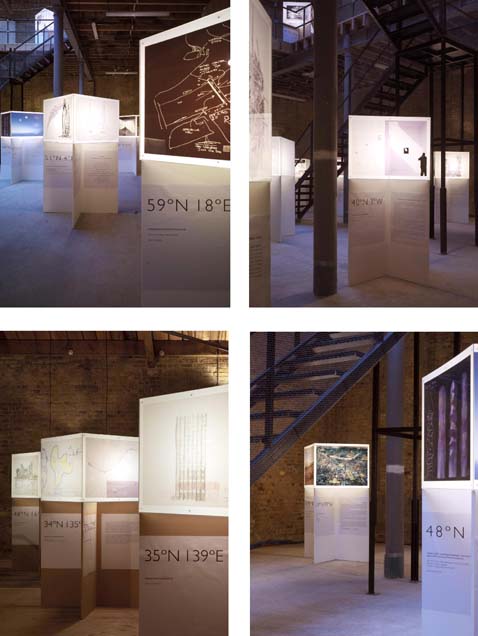 After emailing Cainer expressing interest in the exhibit itself and in the architectural projects it featured, he responded with a PDF from which these images were taken. Here we see interior shots, offering a glimpse of the show’s dominant theme: coordinate points of latitude and longitude, geographic sites of architectural speculation.