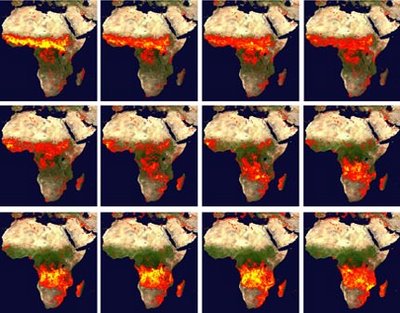 [Image: NASA’s Earth Observatory points us to this incredible series of images, showing the southward migration of agricultural fires across Africa over the course of 2005: “Season after season,” they explain, “year after year, people set fire to African landscapes to create and maintain farmland and grazing areas. People use fire to keep less desirable plants from invading crop or rangeland, to drive grazing animals away from areas more desirable for farming, to remove crop stubble and return nutrients to the soil, and to convert natural ecosystems to agricultural land. The burning area shifts from north to south over the course of the year, in step with the coming and going of Africa’s rainy and dry seasons.” Of course, if you want to know – or see – more, this page has an eye-popping quantity of global fire maps, spanning no less than six years and offered in three levels of resolution. While you’re at it, then, check out the somewhat less exciting MODIS Active Fire Mapping Program or the so-called Web Fire Mapper. Pyro-cartographers, rejoice].