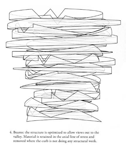 – and absurd. Its form was generated algorithmically as “a helix whose radius varies randomly as it climbs and then falls back down to the valley floor.” The structure’s “intersection points” are then located, acting as stress-sites “through which the structure’s loads are channeled to the ground.”