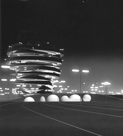 First, it acts as a massive traffic decongestion device… by adding significant mileage to the highway in the form of a spiral. The second purpose is less infrastructural and more cultural: along the spiral you can play slots, roulette, get married, see a show, have your car washed, and ride through a tunnel of love, all without ever leaving your car. It is a compact Vegas, enjoyed at 55 miles per hour and topped off by a towering observation ramp offering views of the entire valley floor below.