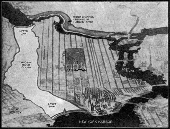 “Plug up the Hudson river at both ends of Manhattan… divert that body of water into the Harlem river so that it might flow out into the East river and down to the Atlantic ocean… pump out the water from the area of the Hudson which has been dammed off… fill in that space… ultimately connecting the Island of Manhattan with the mainland of New Jersey… and you have the world’s eighth wonder – the reconstruction of Manhattan!”
