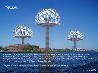 [Image: freezone, by Stanza. According to the project brief, “each unit allows for peace and quiet inside an information free zone.” It’s “the holiday destination of the future.” You can’t be spammed, virused, phoned, emailed, tracked – aside from the fact that your location is rather public – or RFID’d, etc. You could be RPG’d on the other hand… It’s secession from the dataworld, via utopian architecture. More projects, including velodrone, where traffic jams “trigger audio visual light displays of generative music.” (Spotted at WMMNA)].