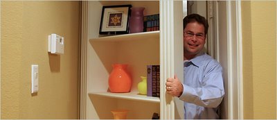 [Image: “David Lee of Plano, Tex., got a bookcase door to hide the mess of his workroom, but also because he had wanted a secret room, he said, ‘since watching Scooby-Doo way back when.'” Misty Keasler/New York Times].