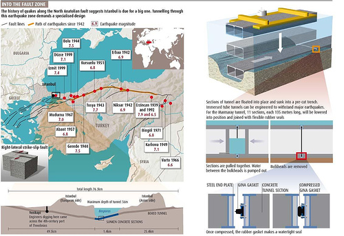 The Marmaray rail link “will not only be the deepest underwater tunnel ever constructed,” it “will also pass within 16 kilometres of one of the most active geological faults in the world.” Indeed, “the abutting plates move about 2 to 3 centimetres relative to each other every year.” However, using “flexible joints made from thick rubber rings reinforced by steel plates,” the central section, passing under the waters between Europe and Asia, will hopefully survive any major quakes. Or hopefully not, if you like disaster/rescue films.