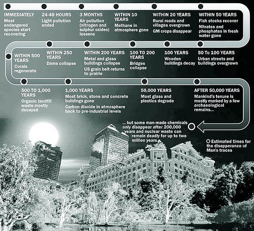 Speaking of future landscapes, New Scientist‘s look at an earth without humans was republished and discussed everywhere last week – but, in case you missed it, here’s a link. From the article: “Left once more to its own devices, Nature would begin to reclaim the planet, as fields and pastures reverted to prairies and forest, the air and water cleansed themselves of pollutants, and roads and cities crumbled back to dust.”