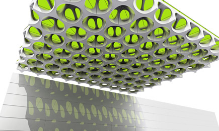 The tiles – algorithmic in design and modular in assembly – are built to reduce vehicular air pollution, including nitrous oxide and ground-level ozone; they can thus “rapidly improve urban environments in terms of air quality and visual appeal.”