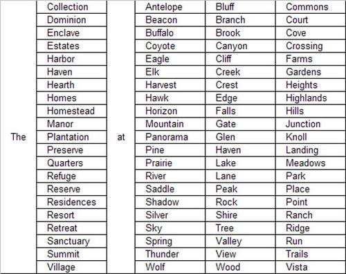 The Quarters at Eagle Shire Place, perhaps? Or maybe The Plantation at Hawk Falls Run? Tough choice. I might have to go with The Harbor at Coyote View Cove. Or The Refuge at Buffalo Peak Ridge. The Summit at Wolf Tree Point.