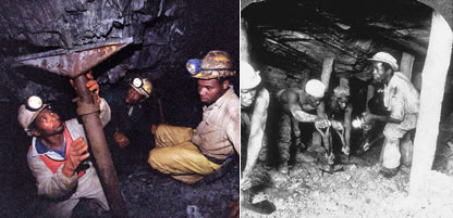 [Image: (left) Workers in a South African gold mine; via Voice of America; (right) “Miners cutting an exploratory tunnel in the Crown goldmine. Johannesburg, South Africa, c. 1935.” (Via) ].