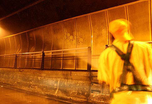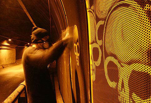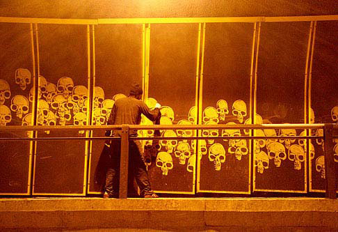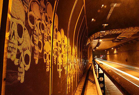 Brazilian artist Alexandre Orion turned a São Paulo transport tunnel into a kind of graphic charnel house, lined with skulls.