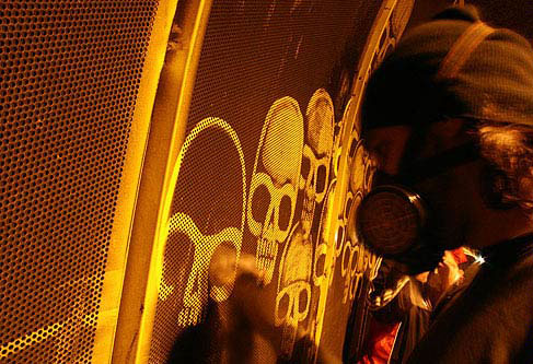 Seeing the image of the firemen spraying the down the walls after this artistic endeavor gave me the feeling I was living a scene from Fahrenheit 451. The state eliminating art to keep the masses unaware of any sort of civil discontent. Maybe if the images were of pink bunnies and puppies they would have stayed, but I prefer the inpermanent skulls any day of the week.