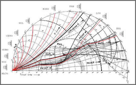 Meanwhile, Dombois also introduces us to the sonic seismicity of southern California, where the aftershocks of 1994’s Northridge quake sound like loose bits of metal banging against the side of a speeding bus. Then we go to Japan, whose plentiful subterranean dislocations come out like snaps of a drum. Finally, of course, we confront distance (the graph, featuring Earth’s surface, mantle, and core, that appears at the top of this post). Clicking on the seismic stations listed round that graph, you get short ambient works that weave together to form endless varieties of terrestrial drones.