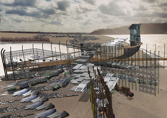 For instance, there’s a project by Mark Mueckenheim called “London Urban Farming.” Mueckhenheim points out that the decline of farmland throughout the EU will necessitate “bring[ing] farming into the urban fabric.” He thus proposes a food processing plant “with a fish hatchery attached to its façade.”
