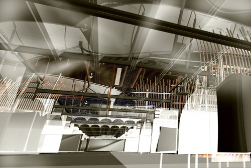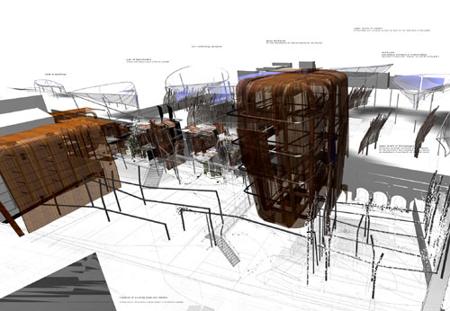 Concentrating specifically on London’s Brick Lane, Schollin describes how the unmaintained city is soon “reeking of rot and humidity.” Her project is a way of “[c]elebrating decay,” she explains, “as the organic inhabitants of the site begin to take over, weaving through, ambivalently undermining and reinforcing the built structure.” The actual architectural proposal appears to involve constructing a kind of permanent exoskeleton around the ruined markets of Brick Lane, complete with “water dispensing ducts” and a “hydro percolating roof.”