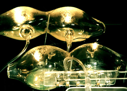 Other projects have a distinctly biological theme – including open bacteriological collaboration with the microbiology lab at University College London. Steve Pike, for instance, outlines an “algaetecture” of blown glass and high transparency acrylic. Inspired by the industrial manufacture of car windshields, these glass structures look simultaneously deformed, alchemic, and bio-anatomical.