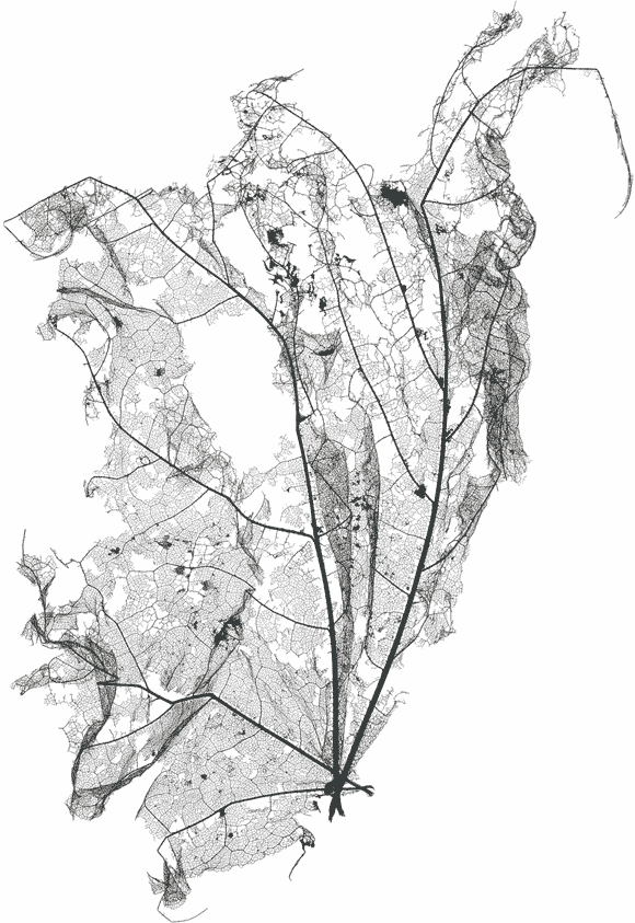 However, what at first appear to be satellite images of obliterated rainforests are actually lone photographs of disintegrating leaves.