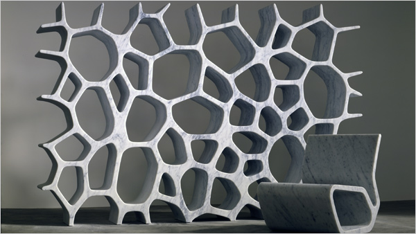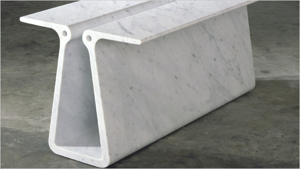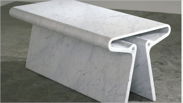 In a recent post on gravestmor we read about the furniture of Marc Newsom. Every table, chair, and bookshelf Newsom designs has been individually milled “from a single slab of marble from the same Carrara quarry” – so there are no hinges and no joinery.